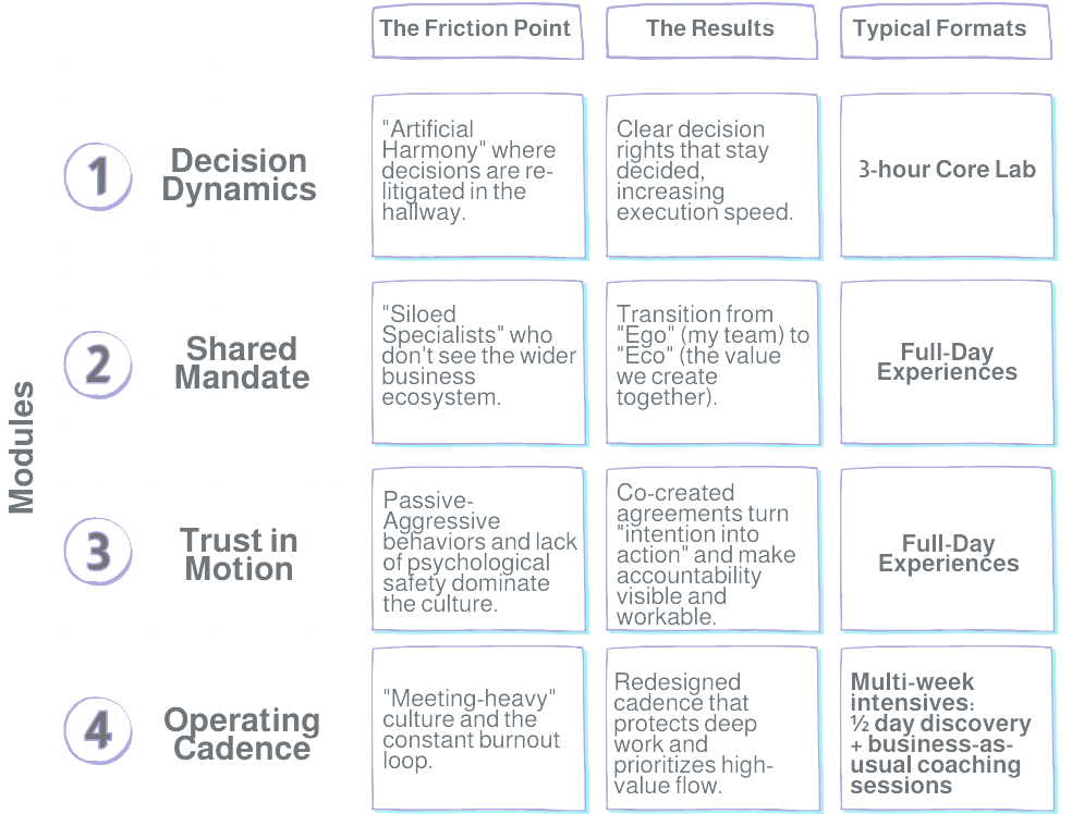Ideal for teams experiencing Level 3 Friction (Structural Impasse) or high-stakes complexity